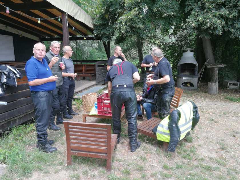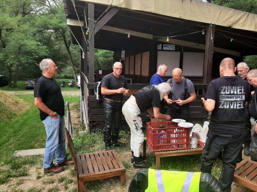 Bei einem Tankstop fielen uns aber die sehr schwarzen Wolkenberge auf, weshalb wir, mit erhöhtem Tempo das Weite gesucht haben. Die Grenze zwischen Frankreich und Deutschland verläuft mitten durch einen Wald und das letzte Stück nach Ludwigswinkel war eine sehr verwunschene Kurvenpiste durch eben jenen Wald, an deren Ende direkt das Hotel liegt. Fast wären wir daran vorbei geheizt. Das Hotel, direkt an einem kleinen Badesee gelegen und mit toller Terasse ausgestattet, konnte uns mit gutem Essen und isotonischen Getränken stärken. Nur am abendlichen Ausschankende mussten wir etwas feilen!