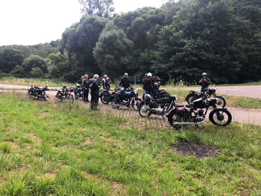 Am Freitag starteten wir nach einem ausgiebigen Frühstück und einer Schiebestarteinlage der Ardie in Richtung Elsass, diesmal mit Armin auf seiner DKW RT 250 als Tourguide. Wir konnten bei schönstem Wetter auf einsamen Straßen durch die Landschaft kurven, bis aus Michaels Hinterreifen -gestört durch einen Dachpappnagel- die Luft gewichen ist. Wir konnten das Problem jedoch durch zahlreiche Hände und Flickzeug in unglaublichen 30 Minuten, incl. Pinkelpause, lösen!